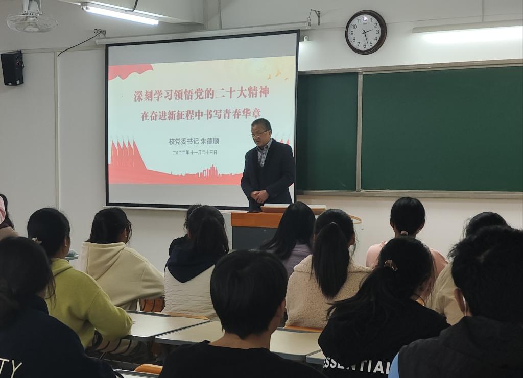 2022年11月23日下午在开云kaiyun官方网站第二教学楼322教室,校党委书记朱德顺为大一新生上了一堂精彩、激昂的“形势与政策”课,以“在奋进新征程中书写青春华章”为题,宣讲党的二十大精神。开云kaiyun官方网站院长助理陈志操主持,2022级经济学普本新生代表参加。