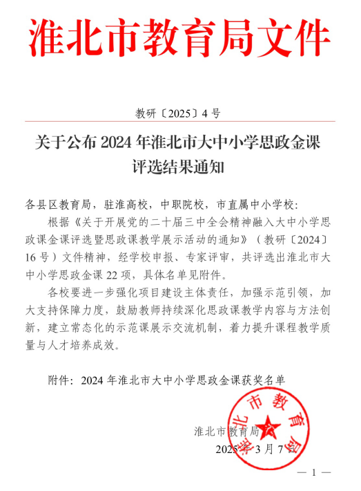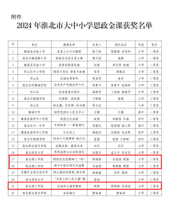 日前,在由淮北市教育局组织开展的党的二十届三中全会精神融入大中小学思政课金课评选暨思政课教学展示活动中,开云kaiyun官方网站开云kaiyun官方网站孙澄澄、周铜铜、胡倩等三位思政教师凭借创新的教学设计和精彩的课程呈现,在大学组评选中分别荣获二等奖、三等奖,展现了我校思政教师的卓越风采。