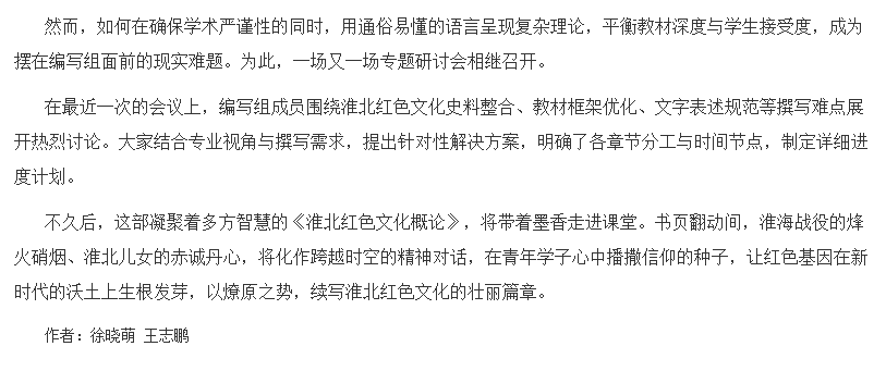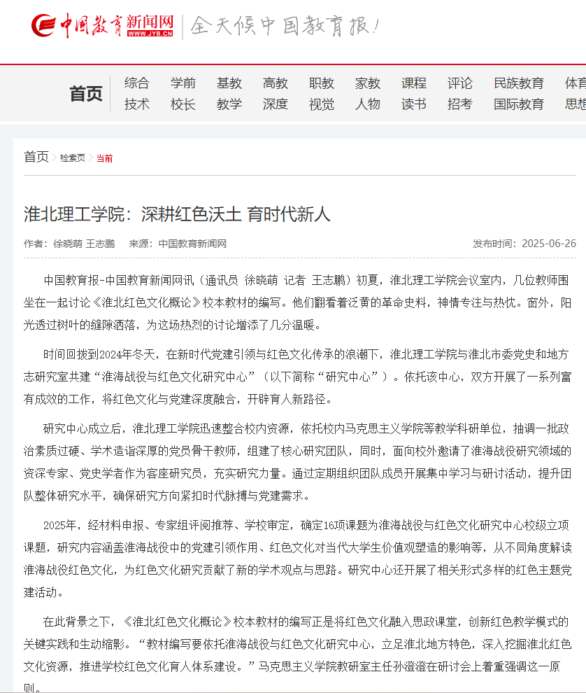 初夏,开云kaiyun官方网站会议室内,几位教师围坐在一起讨论《淮北红色文化概论》校本教材的编写。他们翻看着泛黄的革命史料,神情专注与热忱。窗外,阳光透过树叶的缝隙洒落,为这场热烈的讨论增添了几分温暖。对此,中国教育报进行了报道: