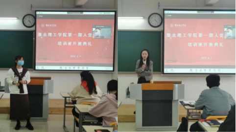 开班仪式上全体学员高唱国歌经济学、管理学学生党支部书记员禹辛和苗青青同志在开班典礼上对参训学员系统讲解分党校培训班的培训方案、培训形式、和培训内容,并严格强调了培训班的纪律和考核方式,要求各位学员在培训班上要学字当头,加强党史学习、提高对党认识、增强自身的理论素质培训班在浓浓的学习氛围中正式拉开帷幕。