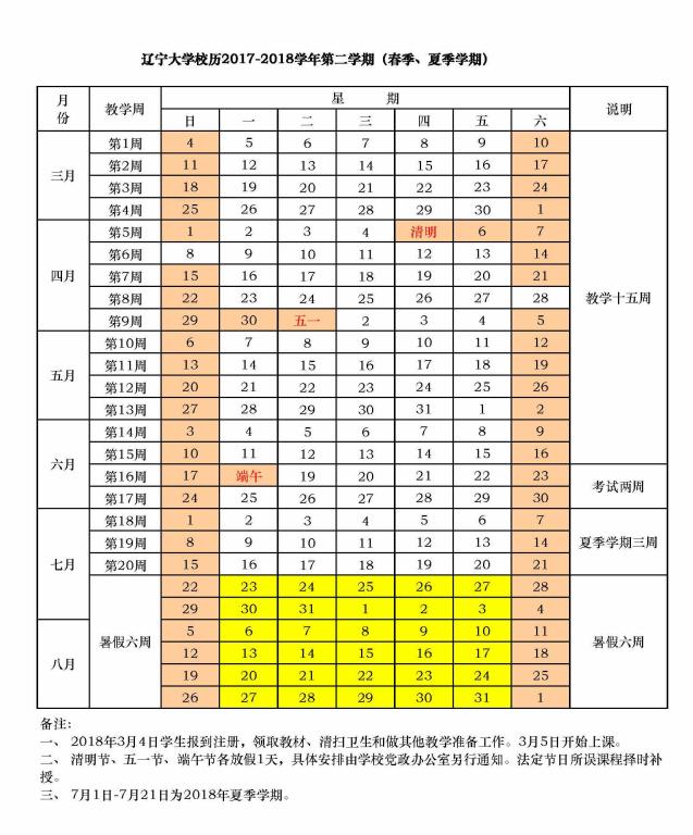 2017-2018学年第二学期(春季、夏季学期)校历