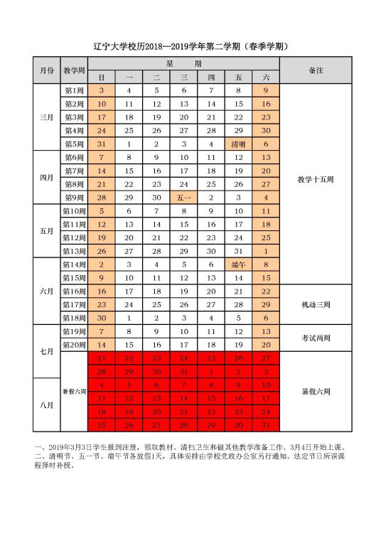 2018-2019学年第二学期(春季学期)校历