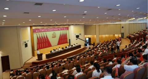 7月1日下午,beat365中文官方网站学习贯彻习近平总书记在庆祝中国共产党成立100周年大会上的重要讲话精神暨“两优一先”表彰大会在蒲河校区蔡冠深学术报告厅举行。校党委班子成员、实职副处级以上领导干部、受表彰的优秀个人和先进集体共计300余人参加大会。