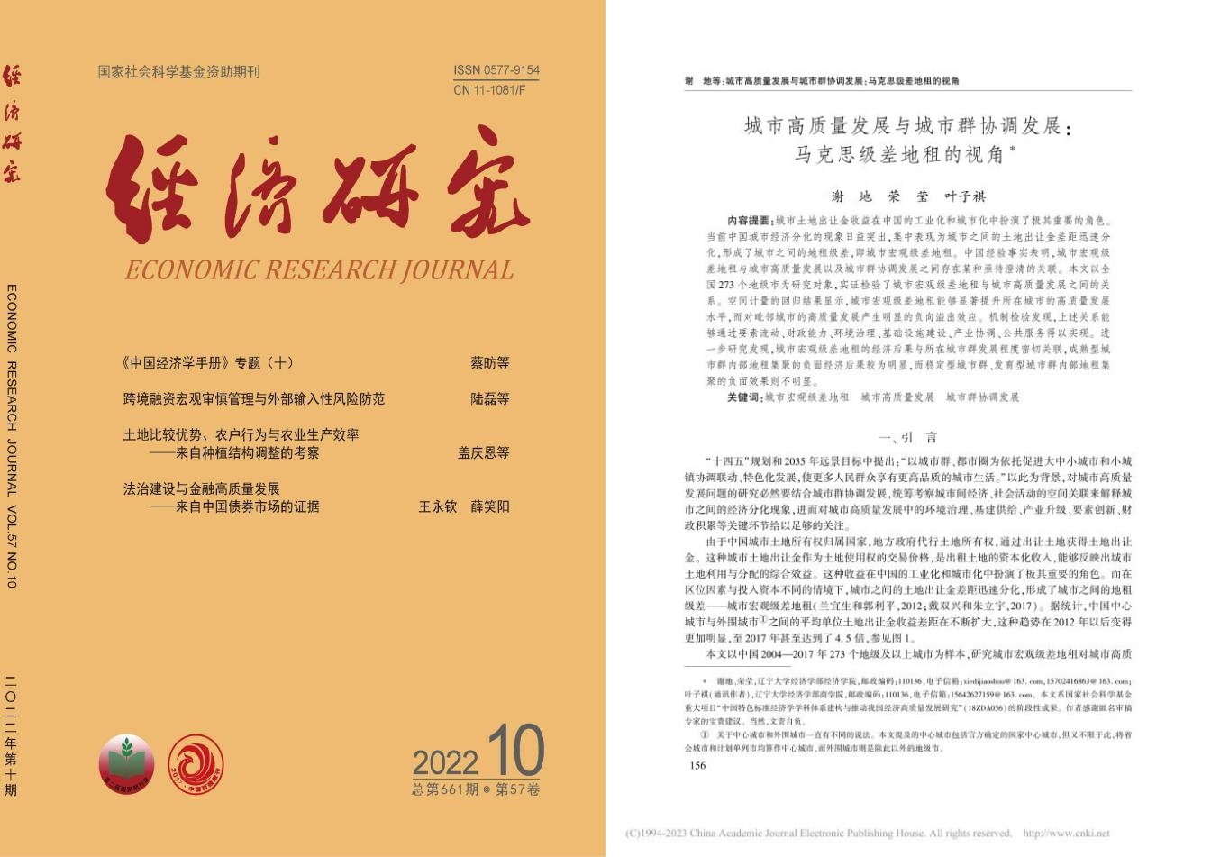 经济学院教授谢地(第一作者)与经济学院博士研究生荣莹(第二作者)、商学院博士研究生叶子祺(通讯作者)的合作论文“城市高质量发展与城市群协调发展:马克思级差地租的视角”在《经济研究》2022年第10期发表。