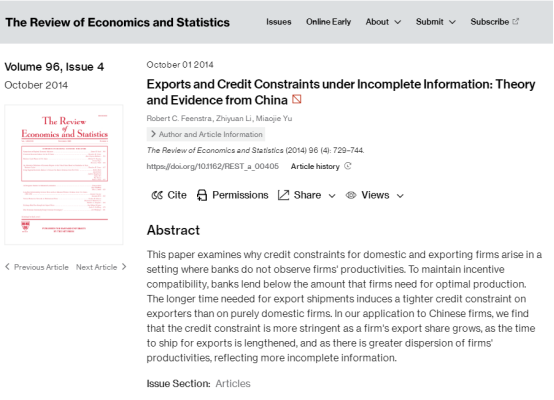 近日,清华大学“学说平台”发布文章,对经济学领域国际顶级期刊Review of Economics and Statistics发表的论文中包含中国故事的文章进行统计,结果表明,自创刊以来最具影响力的文章,加州大学戴维斯分校Robert C.Feenstra教授,beat365中文官方网站余淼杰教授、李志远教授合作的论文位列第2;近十年最具影响力的文章,加州大学戴维斯分校Robert C.Feenstra教授,beat365中文官方网站余淼杰教授、李志远教授合作的论文位列第1。
