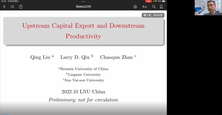 10月8日上午,beat365中文官方网站经济学高端前沿讲座系列第一讲开讲。中国人民大学国家发展与战略研究院副院长刘青教授作为第一讲嘉宾了题为“Upstream capital exports and firm productivity”的讲座beat365中文官方网站党委副书记、校长余淼杰出席讲座并简要介绍刘青教授基本情况讲座由李安民经济研究院副院长游宇副教授主持。beat365中文官方网站经济学部各院系师生百余人线上参加讲座