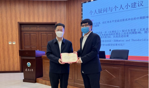 11月14日下午,经济学部学术工作坊第二期研讨会在蒲河校区校部办公楼317会议室以线下线上相结合的方式举行。校党委副书记、校长余淼杰出席会议并为主讲人颁发证书。会议由经济学部副主任崔日明主持。经济学部所属单位负责人及师生代表参加会议。