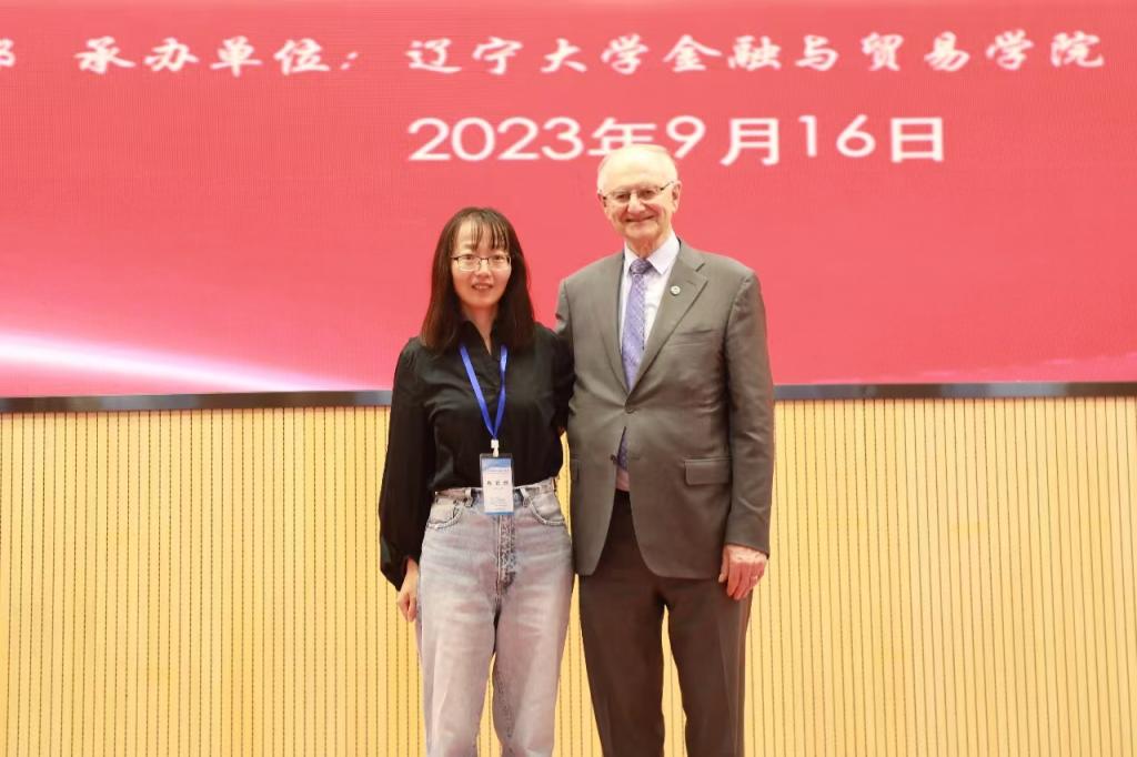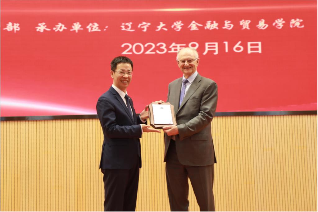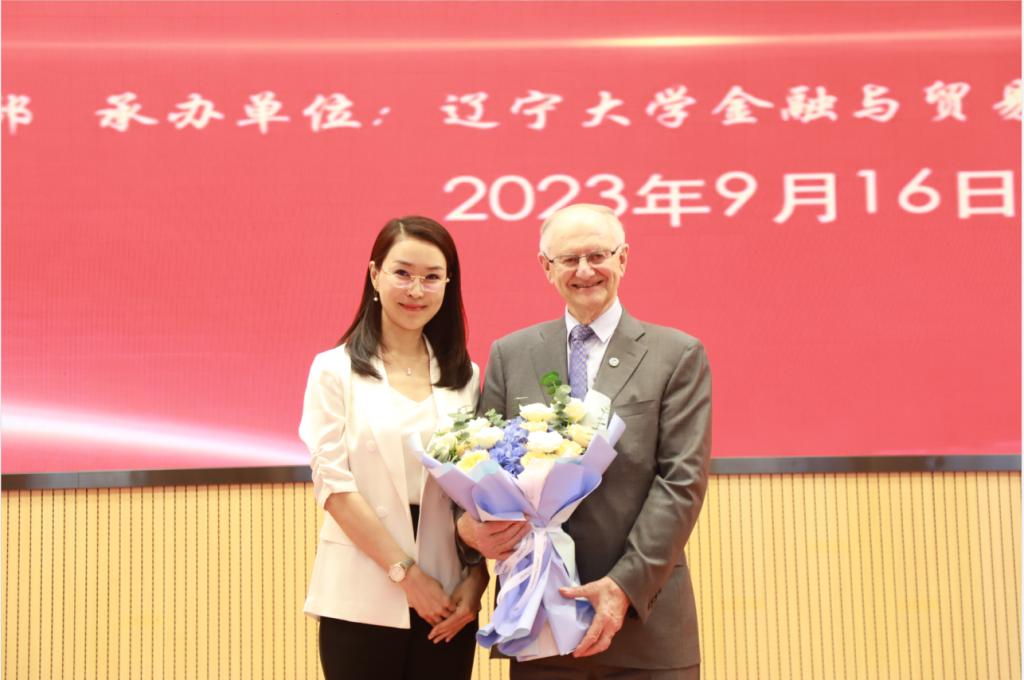 会议最后,余淼杰校长为德莱斯戴尔教授颁发“宋则行海外名家大讲堂”纪念盘和beat365中文官方网站终身名誉教授聘书,金融与贸易学院教师代表殷丽娟、陈芙分别为德莱斯戴尔教授佩戴校徽及献花,与会嘉宾一同合影留念。