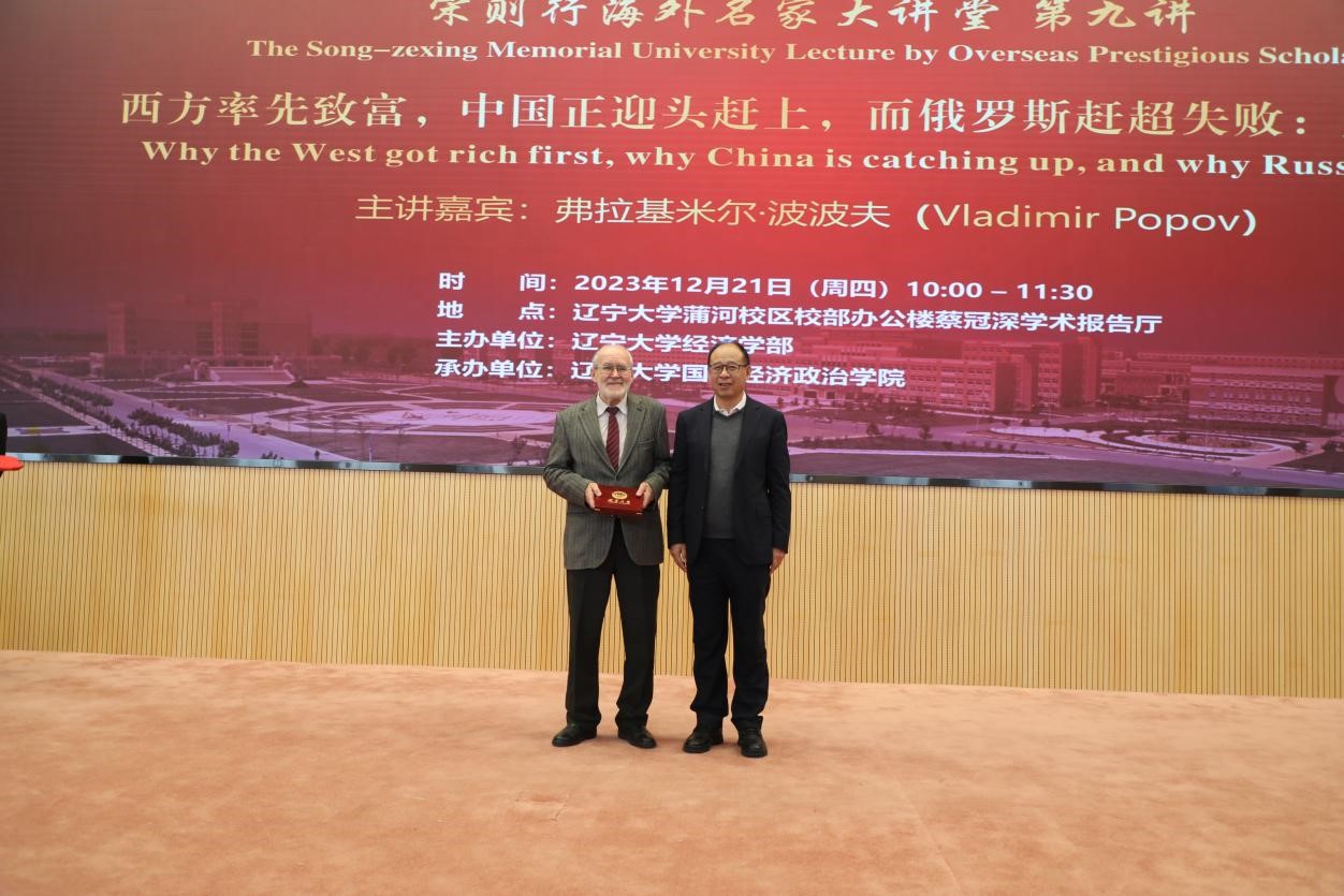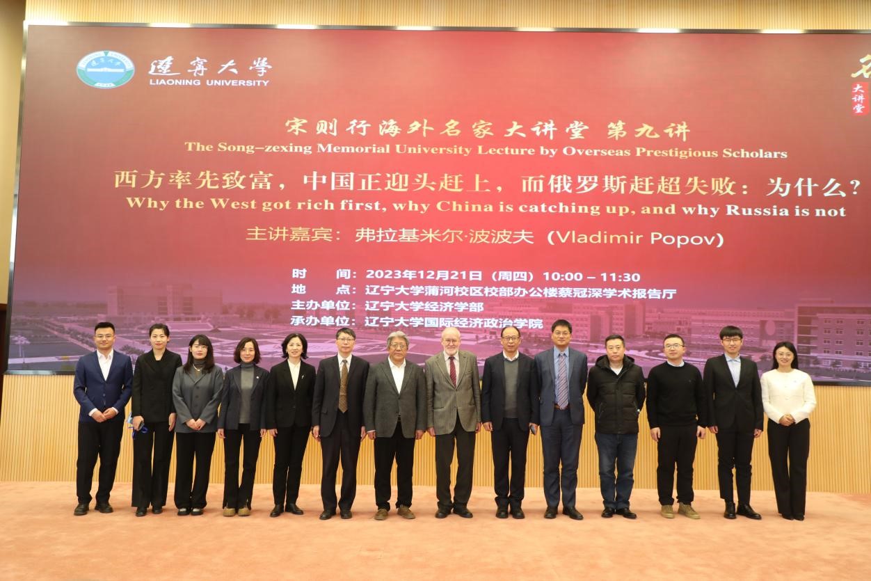 12月21日上午,beat365中文官方网站宋则行海外名家大讲堂(第九讲)在蒲河校区校部办公楼蔡冠深学术报告厅举行。俄罗斯科学院中央经济和数学研究所(CEMI)首席研究员、莫斯科新经济学院名誉教授、渥太华卡尔顿大学欧洲和俄罗斯研究所兼职研究教授弗拉基米尔•波波夫(Vladimir Popov)应邀作了题为《西方率先致富,中国正迎头赶上,而俄罗斯赶超失败:为什么?》(Why the West got rich first, why China is catching up, and why Russia is not?)的学术报告。beat365中文官方网站经济学部分管日常工作副主任谢地教授、经济学部副主任霍伟东教授、国际经济政治学院院长刘文革教授、金融与贸易学院院长李志远教授出席报告会。会议由中俄远东合作与发展研究院执行院长尹如玉博士主持。