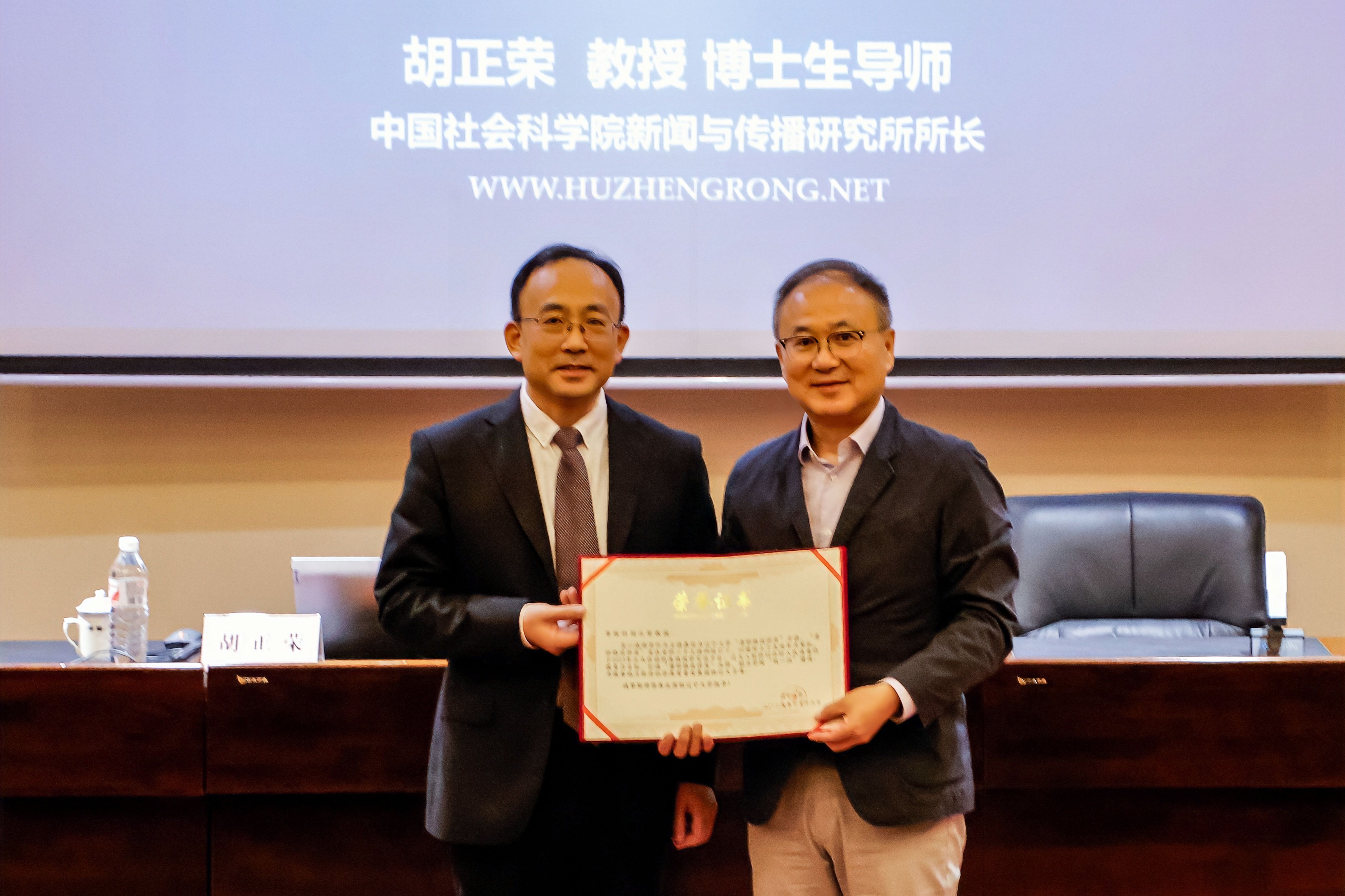 讲座结束后,仇焕广副校长为胡正荣教授颁发了“唐铎格政讲座”纪念证书和纪念盘,新闻与传播学院教师代表尹博向胡正荣教授献花致敬。新闻与传播学院师生代表100余人现场参加了讲座。