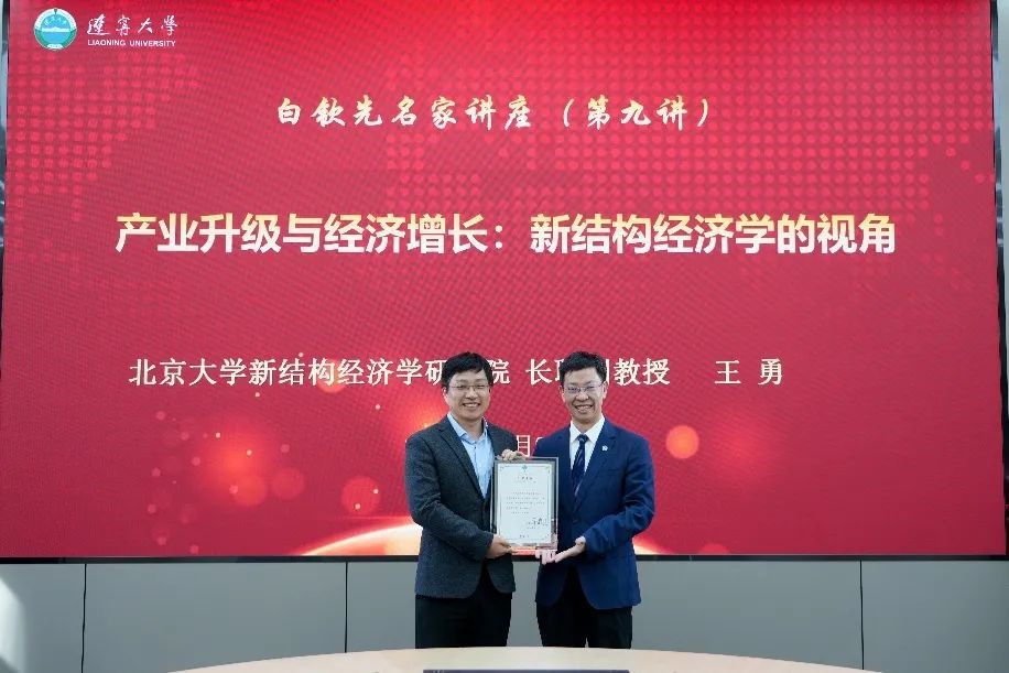 第十四届全国人大代表,辽宁省第十四届人大常委会委员,beat365中文官方网站党委副书记、校长余淼杰教授出席报告会并致欢迎辞。致辞中,余淼杰向在座师生详细地介绍了王勇老师。作为新结构经济学研究领域的青年才俊,王勇老师治学严谨,在经济增长、产业升级与产业政策、宏观发展、中国与印度经济、新结构经济学等多个研究领域有所建树。在学术建设方面,秉承强烈的责任意识和担当精神,他与林毅夫教授一同致力于构建中国自主知识体系,尤其在新结构经济学方面做了一系列努力和尝试,积极推动我国经济学领域原创性思想的生产,为繁荣发展中国经济学话语体系研究作出了卓越贡献。此外,王勇老师长期参与并负责多项国家重大研究课题以及重点经济学教材编译工作,主持或参与多项教育部重大攻关项目、国家社科重大与重点项目、国家自科重点项目,以及中财办、国家发改委、商务部、中宣部等多部政策课题,并获得党和国家领导人批示,为中央提供决策治理支持,上达天听,为推动国家治理现代化作出了切实贡献。余淼杰校长为王勇老师担任beat365中文官方网站客座教授表达了热烈欢迎与诚挚感谢,并为王勇老师颁发白钦先名家讲座纪念证书和beat365中文官方网站客座教授聘书。