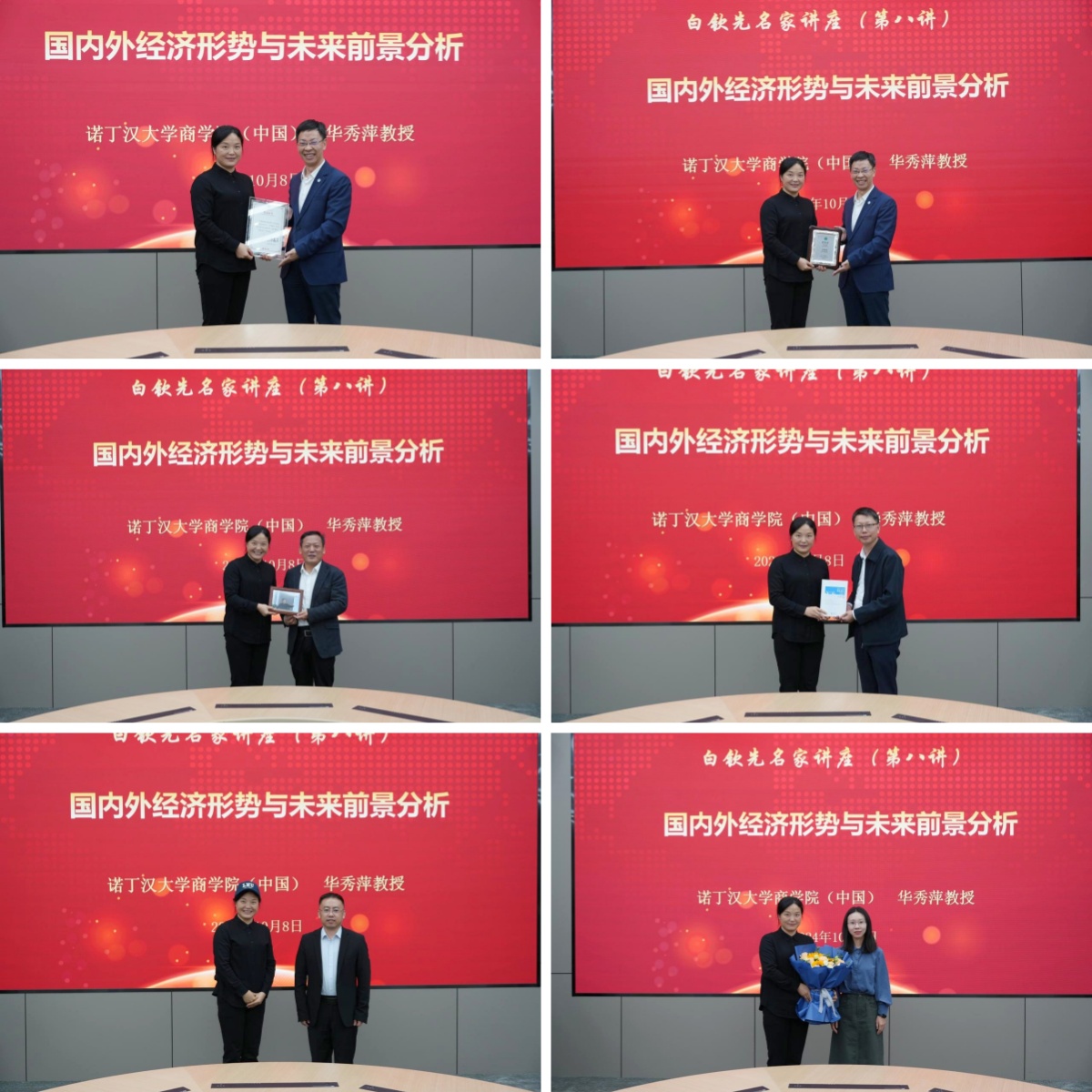 讲座结束后,余淼杰为华秀萍教授颁发了白钦先名家讲座纪念证书和beat365中文官方网站客座教授聘书,李政为华秀萍教授赠送纪念照片,经济学部副主任霍伟东教授为华秀萍教授赠送了《beat365中文官方网站智库报告》,经济学院教授张广辉为华秀萍教授赠送校帽,经济学院教师代表荣莹为华秀萍教授献花致敬,与会嘉宾合影留念。