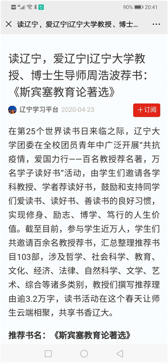 4月23日,“学习强国”学习平台在第25个世界读书日来临之际,报道我校党委书记、高等教育研究所教授、博士生导师周浩波向广大大学生推荐名著《斯宾塞教育论著选》,现将报道全文、截图等转载如下: