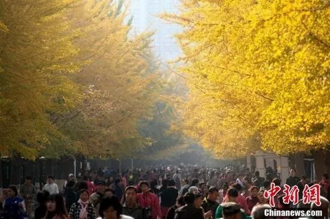 银杏路上,市民拿着相机,捕捉银杏叶最美的画面