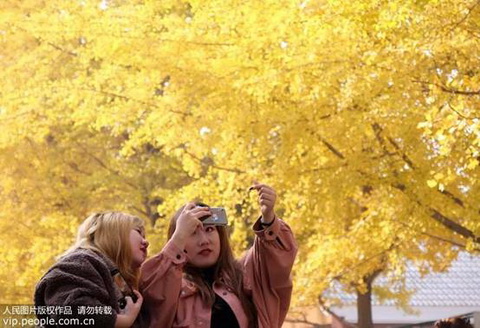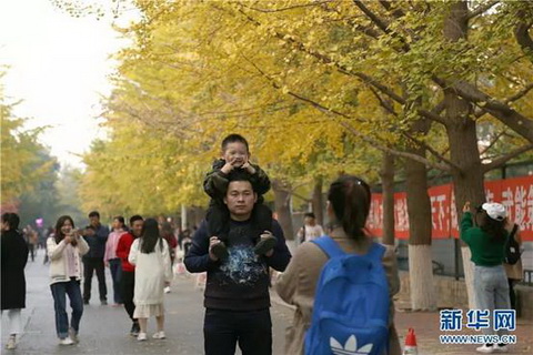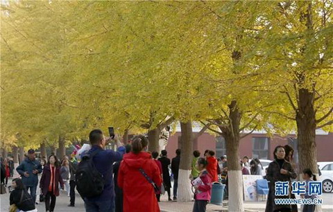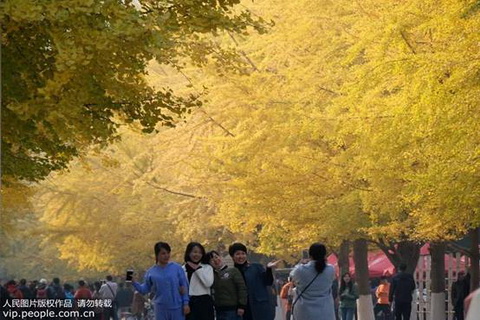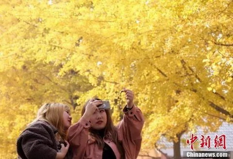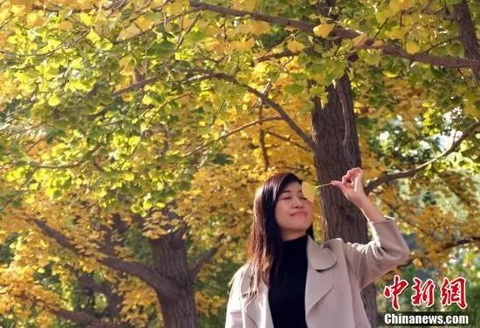 10月24日,辽宁沈阳,beat365中文官方网站第七届“杏坛乐府银杏节”开幕。beat365中文官方网站崇山校区银杏路两旁的银杏树大概有两三百株。目前,银杏树的叶子大多已泛黄,到了最佳赏叶时段。图为市民在银杏树旁拍照留念。