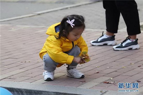 图为一名小女孩捡拾地上掉落的银杏叶和枫叶