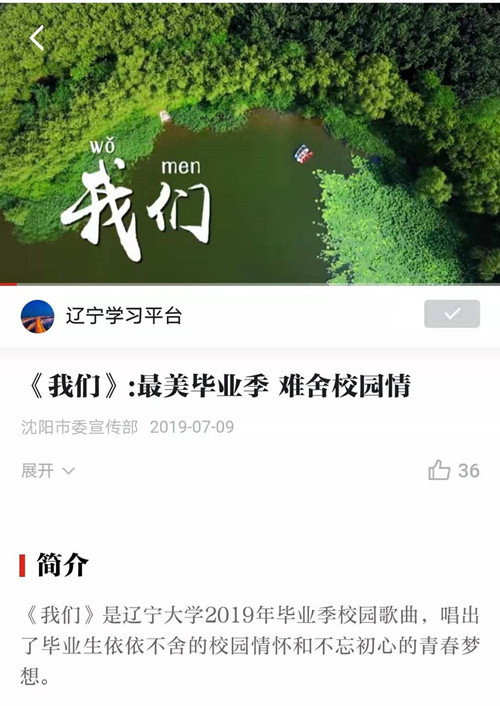 7月9日,“学习强国”于辽宁学习平台发布我校拍摄的毕业季校园歌曲《我们》,现转载如下: