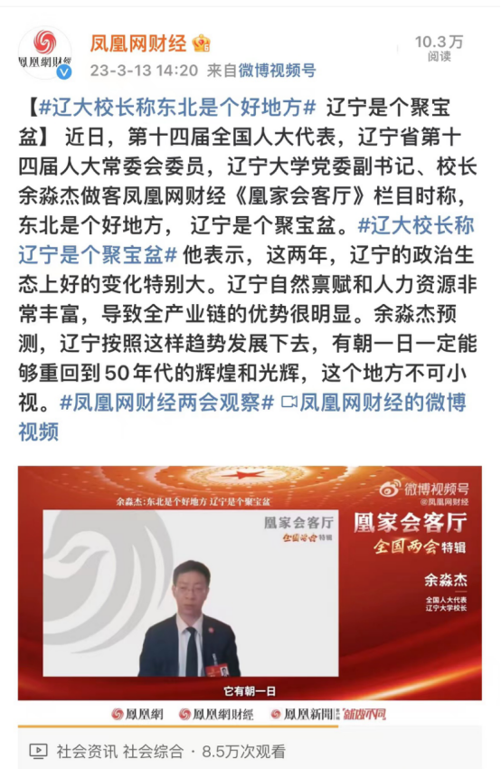 近日,第十四届全国人大代表,辽宁省第十四届人大常委会委员,beat365中文官方网站党委副书记、校长余淼杰做客凤凰网财经《凰家会客厅》栏目时称,东北是个好地方,辽宁是个聚宝盆。他表示,这两年,辽宁的政治生态上好的变化特别大。辽宁自然禀赋和人力资源非常丰富,导致全产业链的优势很明显。余淼杰预测,辽宁按照这样趋势发展下去,有朝一日一定能够重回到50年代的辉煌和光辉,这个地方不可小视。