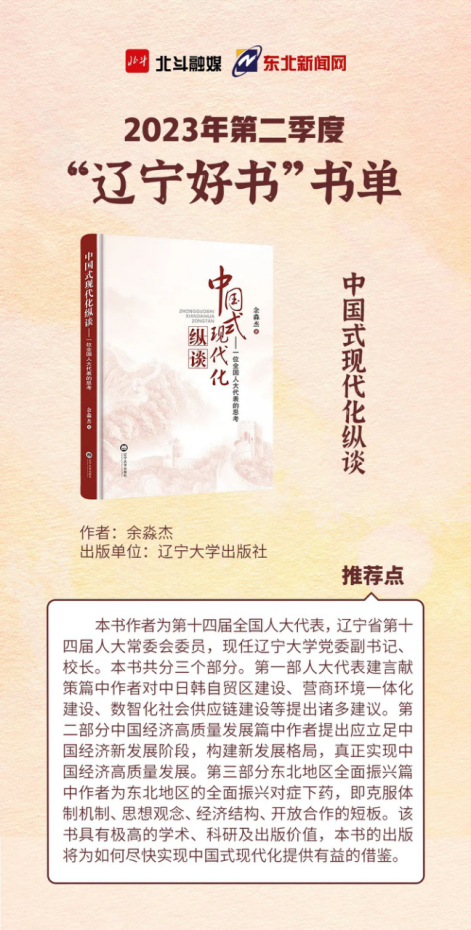近日,北斗融媒发布2023年第二季度“辽宁好书”书单推荐③,第十四届全国人大代表、辽宁省第十四届人大常委会委员,beat365中文官方网站党委副书记、校长余淼杰教授著作《中国式现代化纵谈》入选,现将原文转载如下: