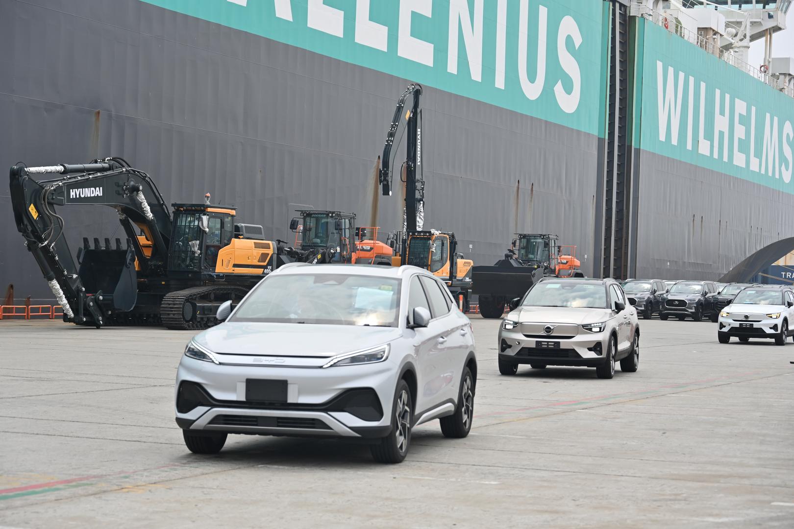 2023年6月23日,上海,外高桥港区海通码头,正在准备上船出口的比亚迪汽车。据视觉中国