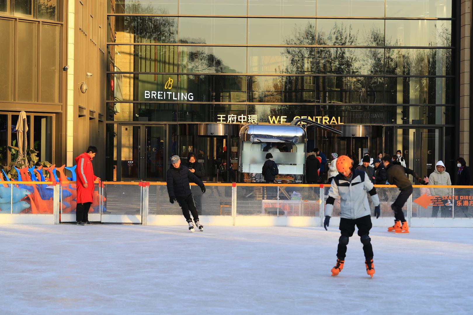 2023年11月24日,北京,市民和游客在王府中環商场西侧的户外冰场——乐滑之梦冰乐园体验冰上运动快乐。据视觉中国