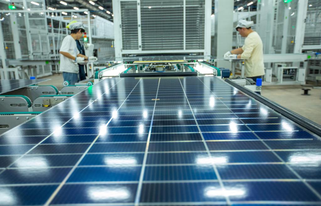 2023年11月3日,浙江金华金东区江东镇工业园区润马光能集团金华组件厂生产车间内,工人们在赶制太阳能光伏组件外贸订单。据视觉中国