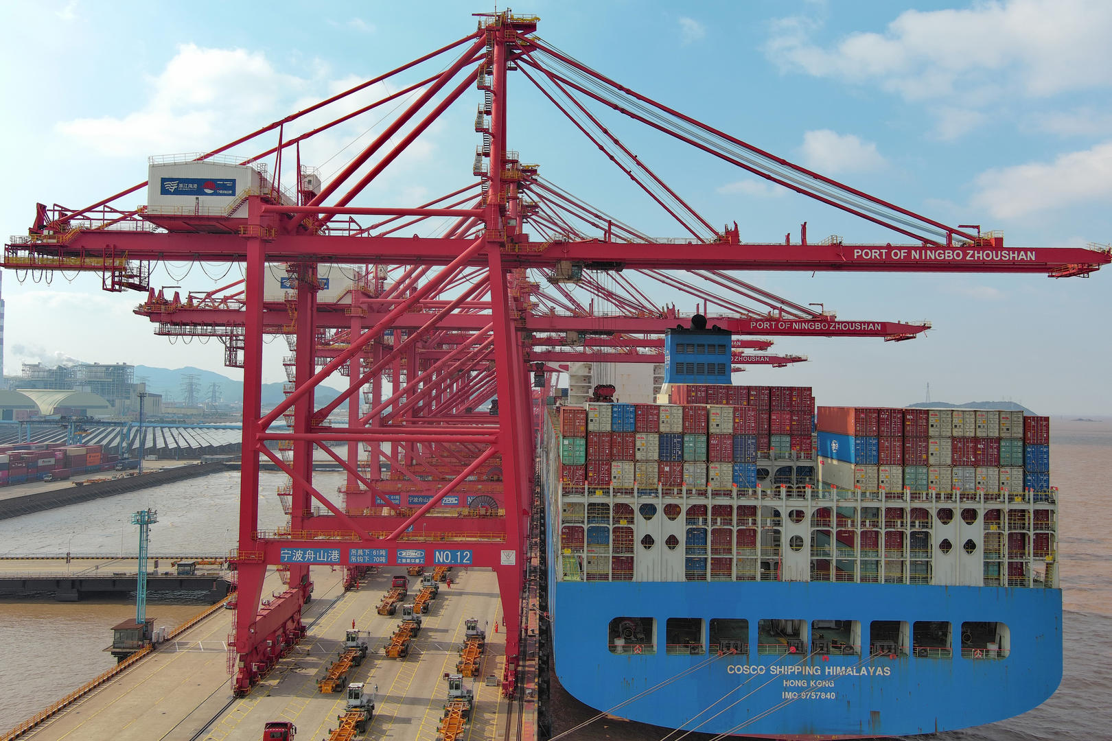 2023年1月16日,浙江宁波舟山港北仑港区一艘货轮正在卸货。据视觉中国