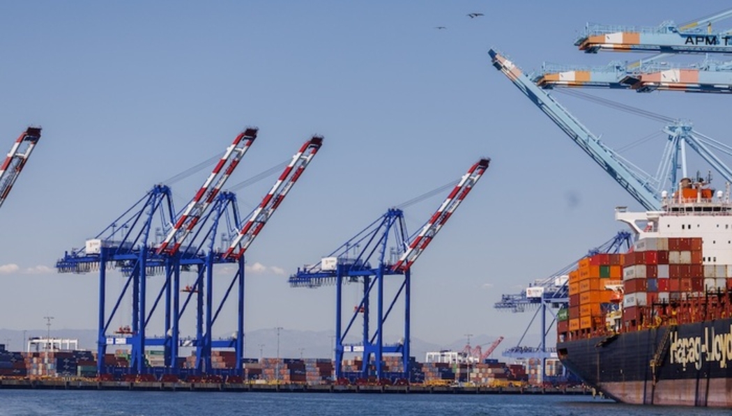 当地时间2025年5月9日,美国加州洛杉矶港风光,左侧通常繁忙的码头现在却集装箱稀少。