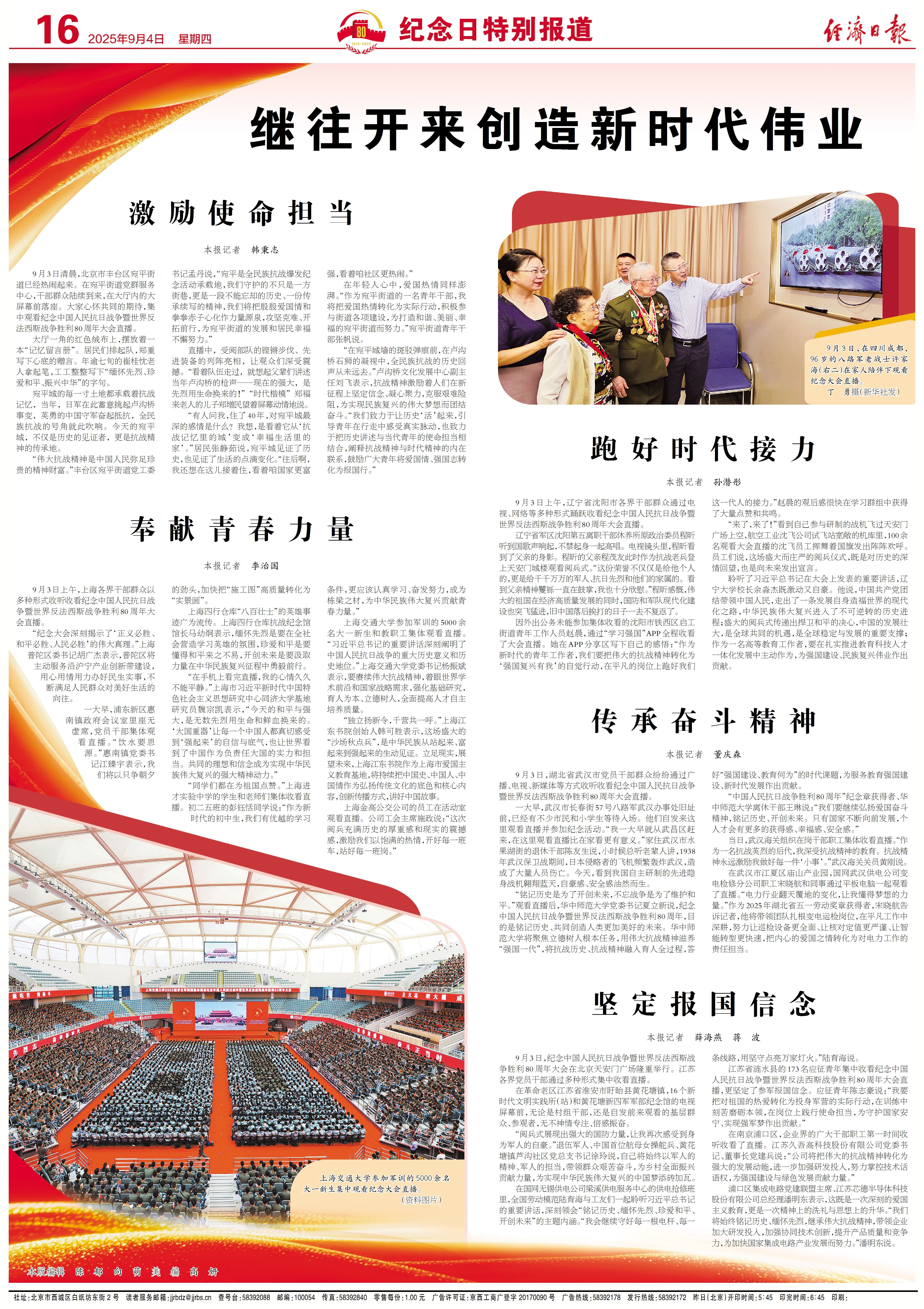 因外出公务未能参加集体收看的沈阳市铁西区启工街道青年工作人员赵晨,通过“学习强国”APP全程收看了大会直播。她在APP分享区写下自己的感悟:“作为新时代的青年工作者,我们要把伟大的抗战精神转化为‘强国复兴有我’的自觉行动,在平凡的岗位上跑好我们这一代人的接力。”赵晨的观后感很快在学习群组中获得了大量点赞和共鸣。