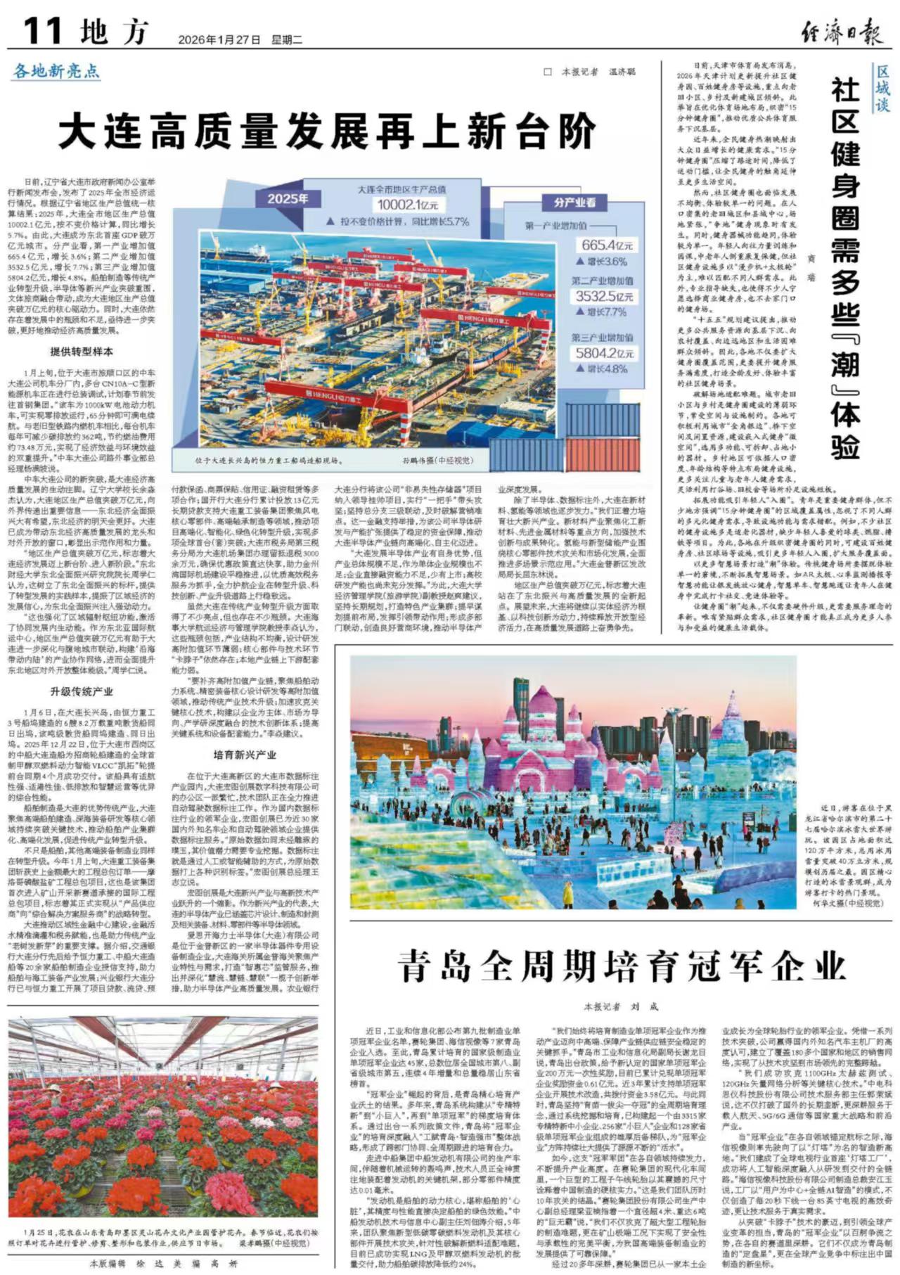 “这也强化了区域辐射枢纽功能,激活了协同发展内生动能。作为东北亚国际航运中心,地区生产总值突破万亿元有助于大连进一步深化与腹地城市联动,构建‘沿海带动内陆’的产业协作网络,进而全面提升东北地区对外开放整体能级。”周学仁说。升级传统产业