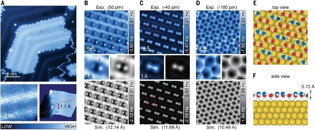 7月15日,beat365中文官方网站院士工作站进站专家王恩哥院士团队与合作者在国际顶级学术期刊《Science》发表了最新研究成果,该工作以“Visualizing Eigen/Zundel cations and their interconversion in monolayer water on metal surfaces” 为题,通过调控氢原子核的量子效应,首次在常压下实现含有对称氢键构型(Zundel构型)的二维冰,得到了一种由核量子效应催生和稳定的全新物态。