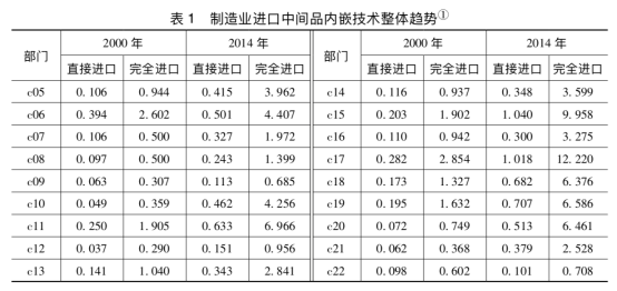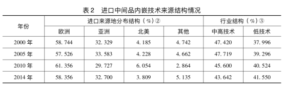 研究团队测算了中国制造业进口中间品内嵌技术水平(表1),并以计算机、电子及光学设备制造业为例,分析了进口中间品内嵌技术来源结构(表2)。