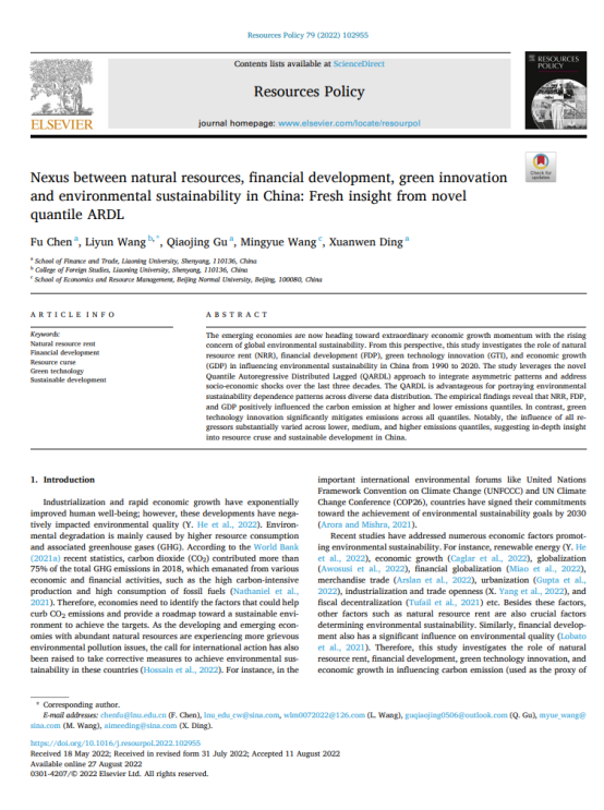 金融与贸易学院教师陈芙的学术论文“Nexus between natural resources, financial development, green innovation and environmental sustainability in China: Fresh insight from novel quantile ARDL”在国际知名期刊《Resources Policy》2022年第79卷发表。学院研究生顾巧静、本科生王明月、丁炫文参与论文写作,位列第三、第四、第五作者。该期刊系SSCI来源期刊,JCR分区Q1,2021年影响因子8.222,期刊类别排序13/127。