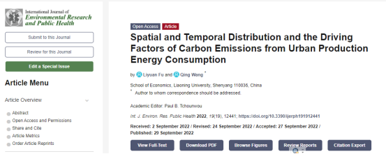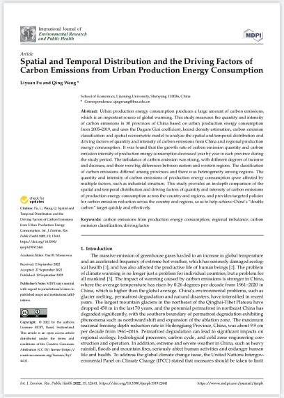 经济学院王青教授(通讯作者)与博士研究生傅莉媛(第一作者)合作完成的论文Spatial and Temporal Distribution and the Driving Factors of Carbon Emissions from Urban Production Energy Consumption在International Journal of Environmental Research and Public Health发表。