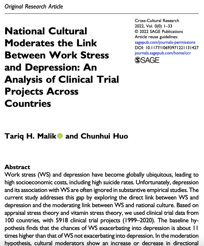亚澳商学院Tariq H.Malik教授与霍春辉教授合作撰写的学术论文National Cultural Moderates the Link Between Work Stress and Depression: An Analysis of Clinical Trial Projects Across Countries在Cross-Cultural Research发表。