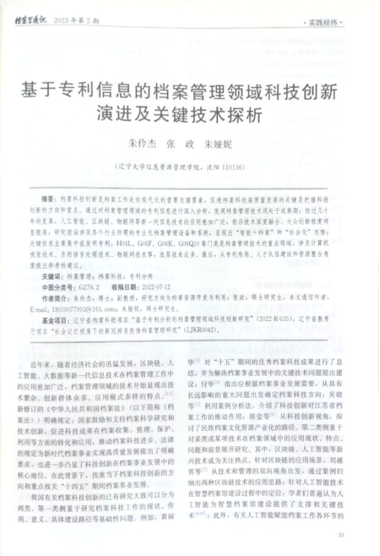 历史学部信息资源管理学院朱伶杰副教授在《档案学通讯》(校C、CSSCI)2023年第2期发表论文《基于专利信息的档案管理领域科技创新演进及关键技术探析》。