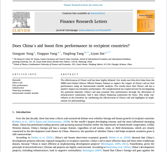 国际经济政治学院杨攻研教授(第一作者)与戴利研教授(通讯作者)等共同完成的学术论文Does China’s aid boost firm performance in recipient countries?2023年3月在国际知名期刊Finance Research Letters发表。