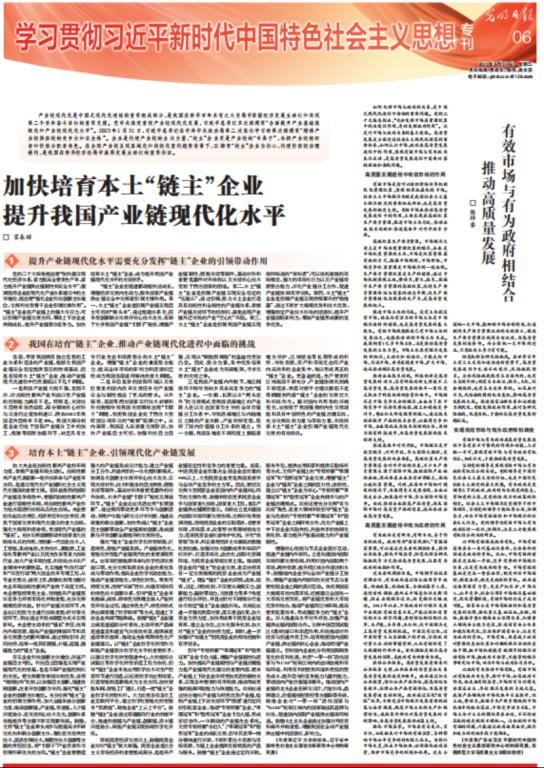 最后,文章提出培育本土“链主”企业、引领现代化产业链发展的如下建议:加大央企在战略性新兴产业的布局力度,掌握产业链布局主动权;夯实企业科技创新主体地位,保证产业链自主可控;强化“链主”企业数字化转型赋能,打造绿色、智能产业链集群;厚植民营经济发展沃土,鼓励民营企业对标“链主”企业做大做强;引导“专精特新”“单项冠军”和“隐形冠军”企业卡位入链,增强产业链韧性与活力;增强核心枢纽与节点企业良好互动,促进产业链内外循环。