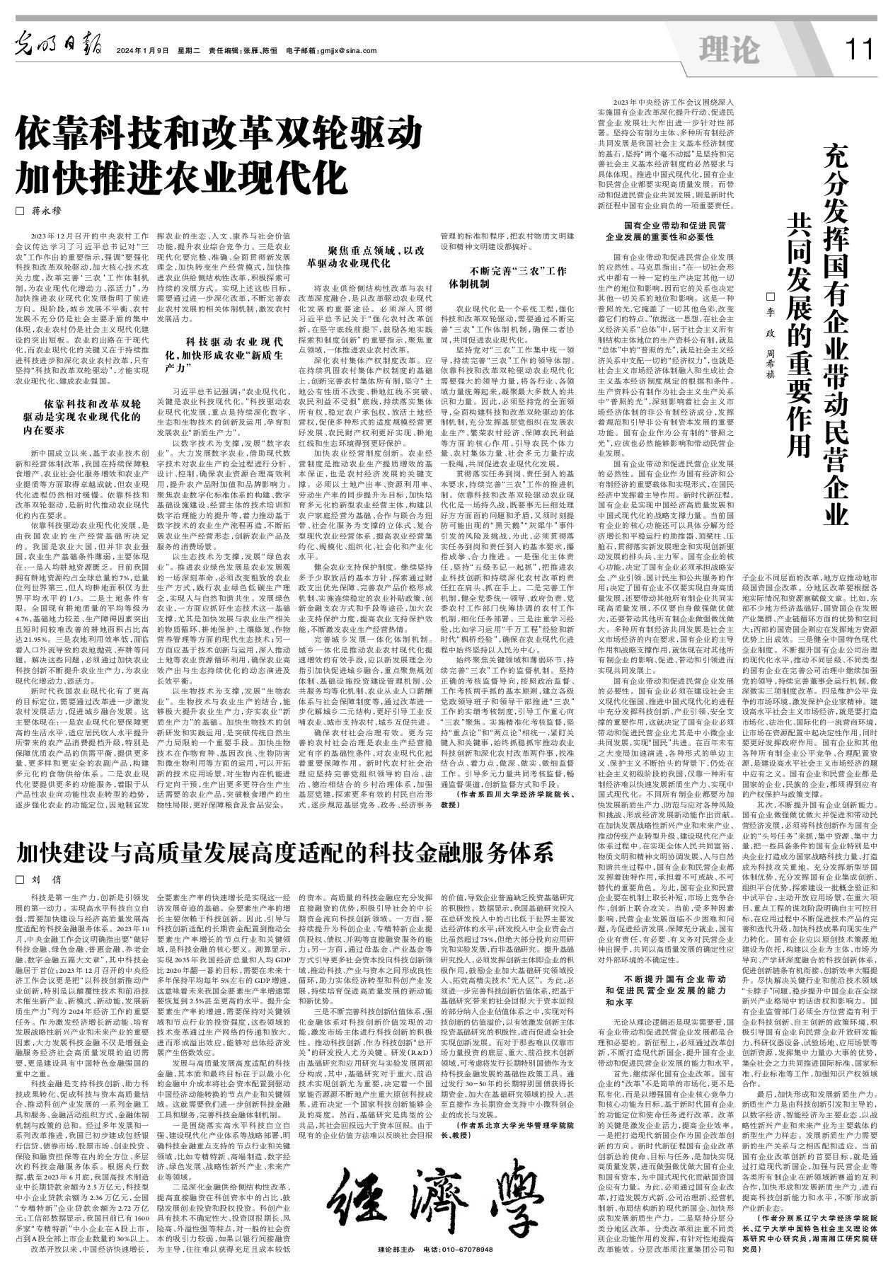 最后,加快形成和发展新质生产力。新质生产力是由科技创新引发和主导的,以数字经济、智能经济为主要业态,以战略性新兴产业和未来产业为主要载体的新型生产力样态。发展新质生产力需要新的生产关系与之相匹配和适应。当前国有企业改革创新的首要目标,就是通过打造现代新国企,加强与民营企业等各类所有制企业在新领域新赛道的互利合作,加快形成和发展新质生产力,进而提高科技创新能力和水平,不断形成新产业新业态。
