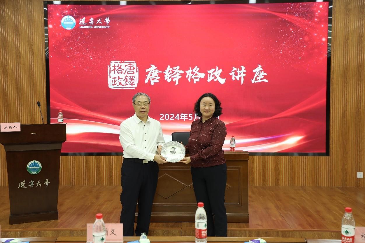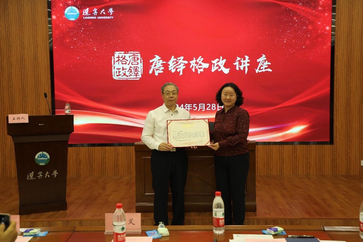 报告会结束后,李宇鹏副校长为蒋辅义教授颁发“唐铎格政讲座”纪念证书、纪念盘,中国经济研究院副院长兼金融与贸易学院副院长马湘君教授向蒋辅义教授献花致敬。
