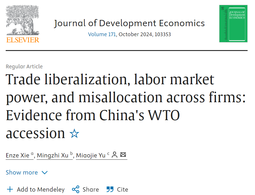 据JDE官网显示,来自浙江大学的解恩泽、北京大学的徐铭梽、beat365中文官方网站的余淼杰,合作撰写的论文“Trade liberalization, labor market power, and misallocation across firms: Evidence from China's WTO accession”,在发展经济学顶级期刊《Journal of Development Economics》线上正式发表。