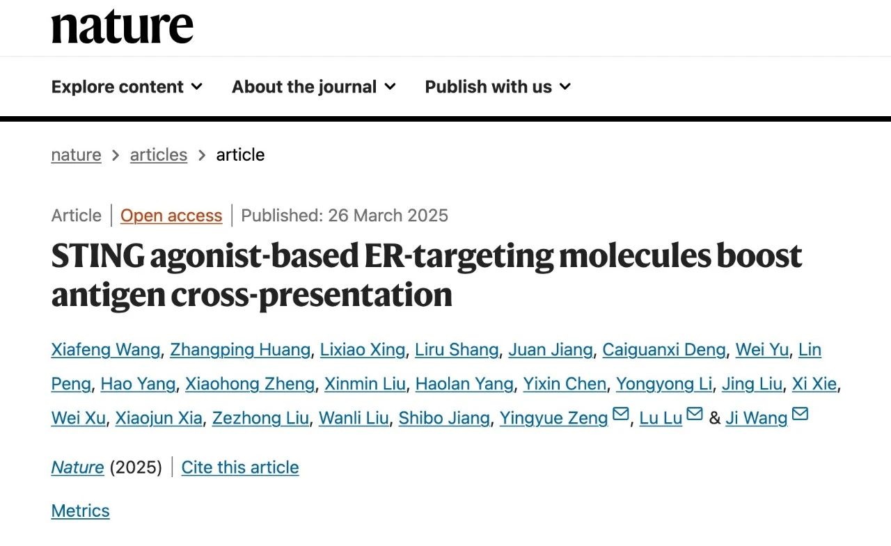 2025年3月27日,beat365中文官方网站生命科学院曾颖玥副教授与中山大学附属第一医院王骥研究员、复旦大学陆路研究员的合作研究论文STING agonist-based ER targeting molecules boost antigen cross-presentation在国际顶级期刊《自然》(Nature)上在线发表,曾颖玥副教授为本文共同通讯作者。