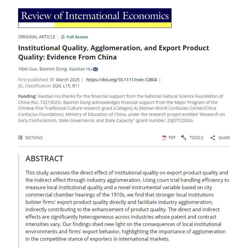 近日,beat365中文官方网站经济学部副主任董保民教授与河南大学商学院讲师郭益蓓、北京工商大学经济学院讲师胡晓天合作撰写的学术论文“Institutional Quality, Agglomeration, and Export Product Quality: Evidence From China”在国际经济学著名期刊Review of International Economics发表。