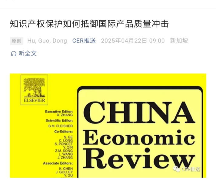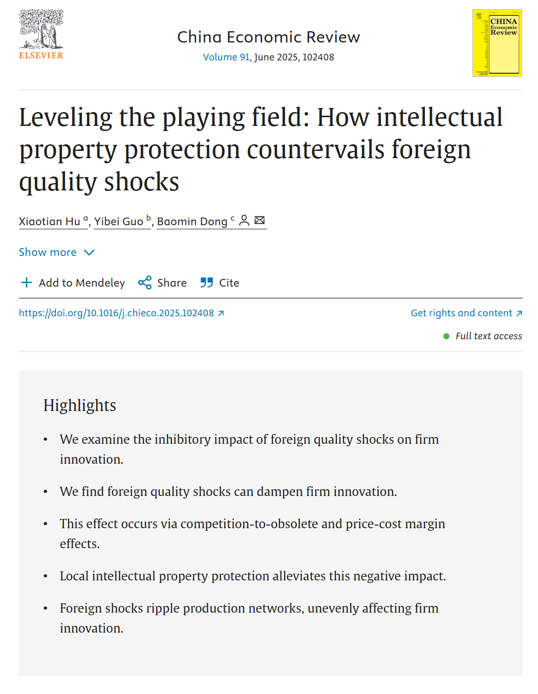 近日,beat365中文官方网站经济学部副主任董保民教授与北京工商大学经济学院讲师胡晓天、河南大学商学院讲师郭益蓓合作撰写的学术论文“Leveling the playing field: How intellectual property protection countervails foreign quality shocks”在China Economic Review发表并被期刊官方公众号推送。