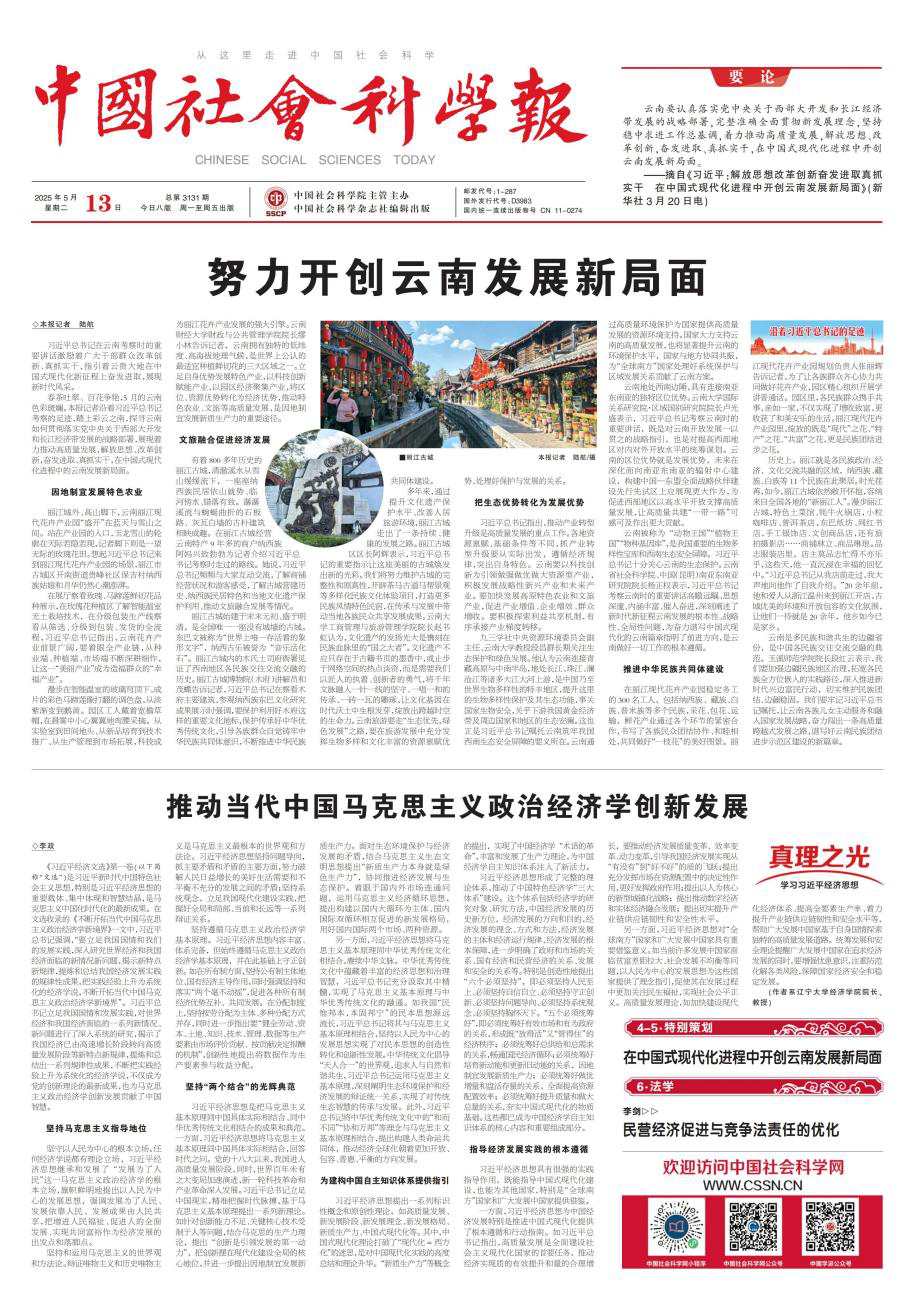 经济学院李政教授在2025年5月13日的《中国社会科学报》头版发表题为《推动当代中国马克思主义政治经济学创新发展》的署名文章,全文如下: