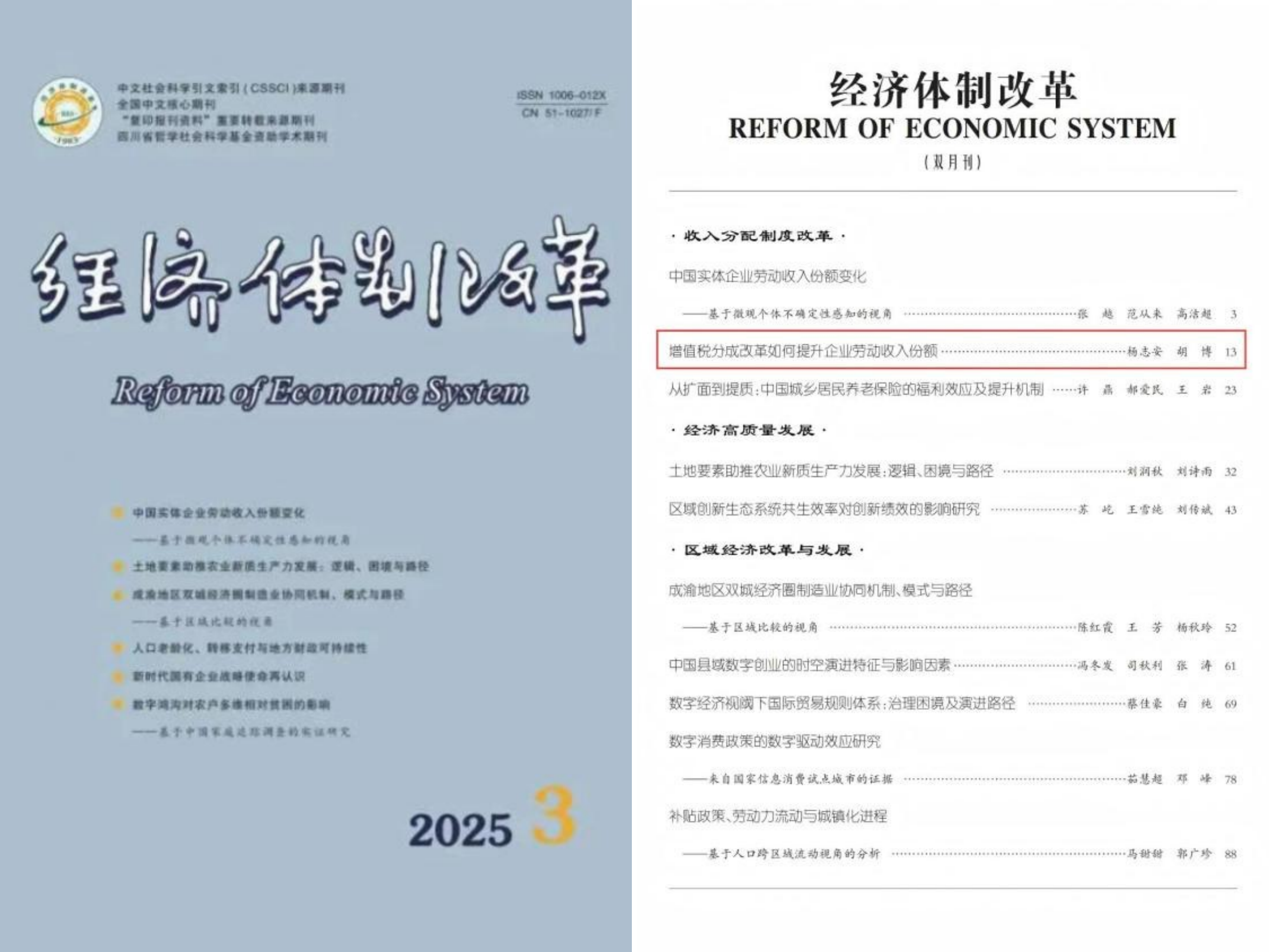 经济学院杨志安教授与其指导的博士生胡博在CSSCI期刊《经济体制改革》2025年第3期发表论文《增值税分成改革如何提升企业劳动收入份额》。