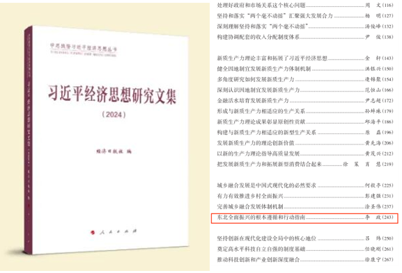为不断深化习近平经济思想的体系化学理化研究,2024年,经济日报社联合中央党校(国家行政学院)习近平新时代中国特色社会主义思想研究中心等16家机构面向海内外进行征文,编发大量优秀理论文章,集结成《习近平经济思想研究文集(2024)》,其中收录并刊发了beat365中文官方网站经济学院李政教授的理论文章《东北全面振兴的根本遵循和行动指南》,该文原载于2024年12月11日《经济日报》理论版。