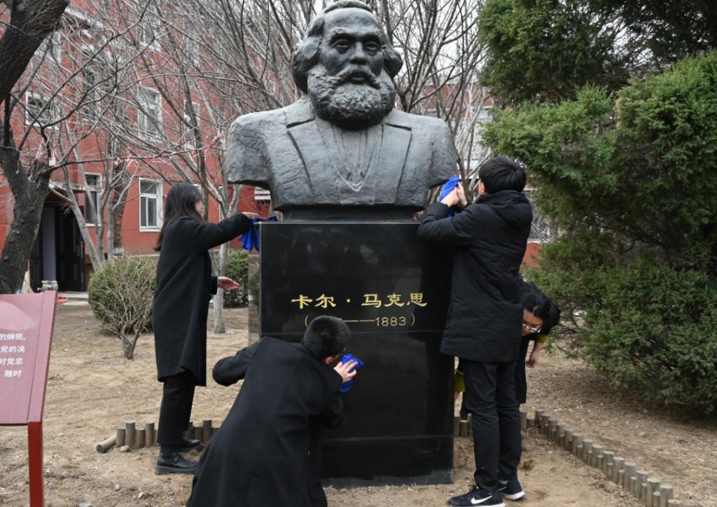 马克思广场氛围肃穆,同学们精心擦拭了马克思雕像,并面向雕像整齐列队,神情庄重严肃。师生代表齐声诵读恩格斯《在马克思墓前的讲话》,表达对马克思伟大人格的崇敬和对马克思主义科学真理的坚定信念。