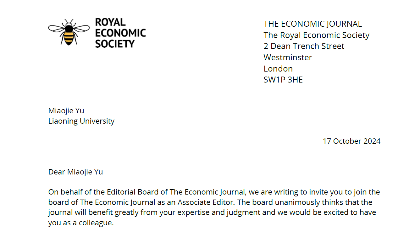 余淼杰教授将于近日起负责全球相关中国经济研究方面论文的审核以及参与负责年度多期特刊集(Special Issues)的评审和录用。这一任命不仅是对余淼杰教授个人学术能力以及学术贡献的认可,也是中国经济学界的荣誉,进一步彰显了中国经济学研究在国际学术界不断提升的地位和影响力,有利于进一步讲好中国故事、传播好中国声音。