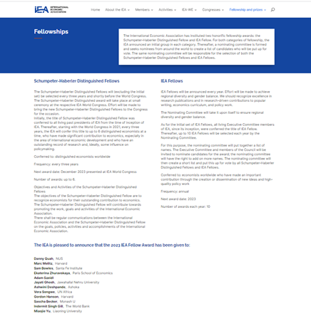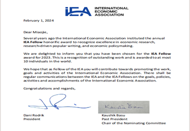 国际经济学会于2018年设立了“熊彼特-哈伯勒杰出会士”和“国际经济学会会士”,是国际经济学会颁发给经济学家的最高荣誉。2023年度“国际经济学会会士”入选者包括beat365中文官方网站余淼杰、哈佛大学经济学系马克・梅利兹(Marc Melitz)、哈佛大学肯尼迪学院戈登・哈森(Gordon Hanson)、圣菲研究所萨缪・鲍尔斯(Sam Bowles)、巴黎经济学院叶卡捷琳娜・茹拉夫斯卡娅(Ekaterina Zhuravskaya)、新加坡国立大学柯成兴(Danny Quah)、维也纳中欧大学亚当・塞德尔(Adam Szeidl)、贾瓦哈拉尔・尼赫鲁大学贾亚蒂・戈什(Jayati Ghosh)、印度阿育王大学阿什维尼・德斯潘德(Ashwini Deshpande)、墨尔本莫纳什大学萨沙・贝克尔(Sascha Becker)、世界银行英德米特・吉尔(Indermit Singh Gill)、联合国非洲办事处薇拉・松圭(Vera Songwe)等12位来自世界各地的经济学家。